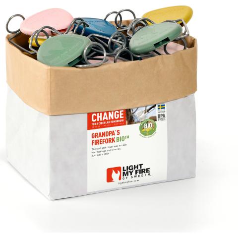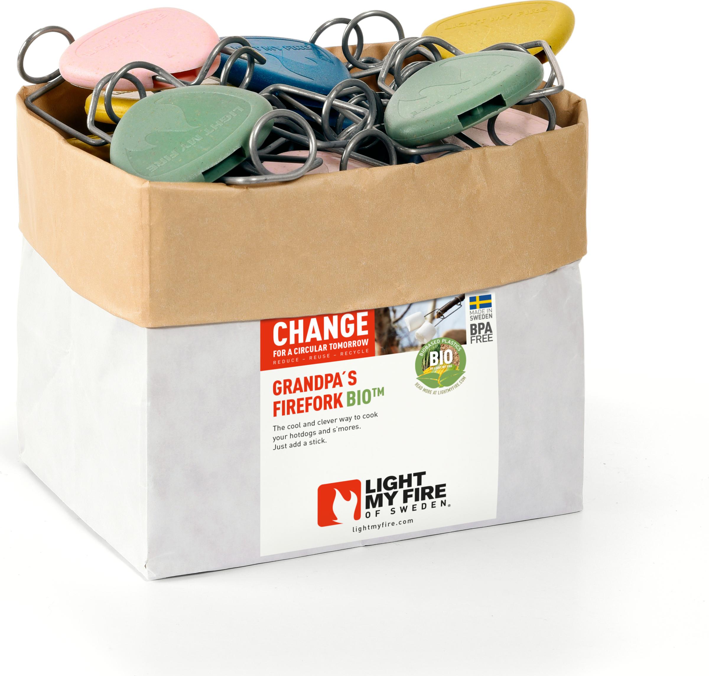 FireFork BIO on teräksinen makkaratikun pikaliitospää, joka lukittuu helposti keppiin tai puutikkuun. Kulkee reissussa mukana ja mahdollistaa makkaran, vaahtokarkkien tai vihannesten kypsyttämisen kaikkialla missä on tulta. Irrotettavissa nopeasti käytön jälkeen seuraavaa kertaa varten. Helppo kuljettaa piikit työnnettynä toimitukseen kuuluvaan suojakoteloon. Suojakotelossa kiinnityspiste kaulanauhalle tai muulle kiinnitysnarulle. Pit. 10 cm, lev. 5 cm. Paino 10 g / kpl.
