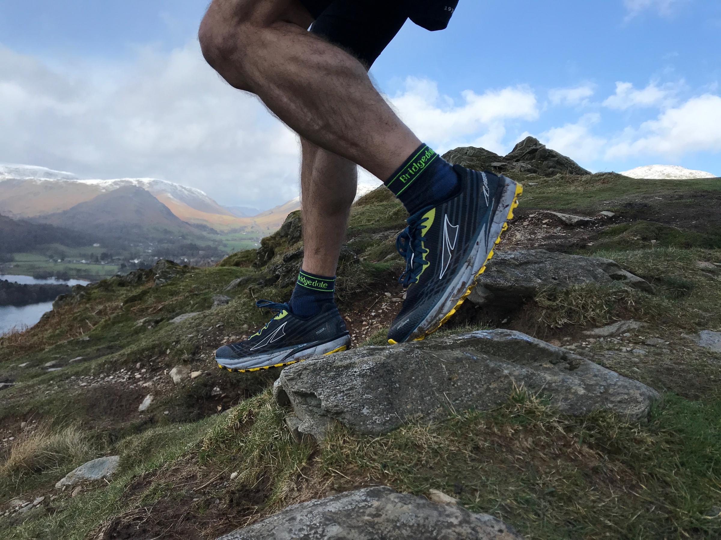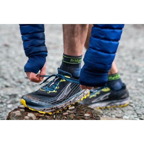 Miesten kevyt polkujuoksusukka keskimittaisella varrella.