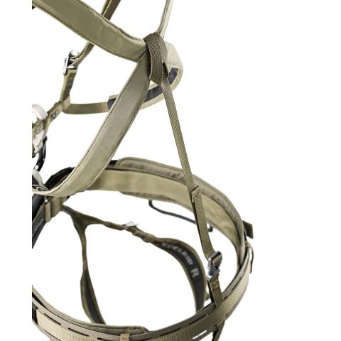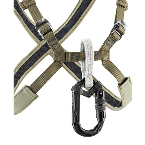- Valmistettu ohuesta 15 mm hihnasta. Kiinnityslenkki, jossa on Dyneema-ydin ja polyamidipäällyste; erottuu kontrastin ansiosta valjaiden pääväristä