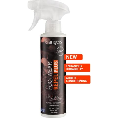 Vinkki: Nahkakengissä Footwear Repel Spraytä voidaan käyttää Grangers Leather Conditioner (GRF81) hoitoainekäsittelyn päällä parantamassa jalkineen vesitiiveyttä (enemmän vesitiiviyttä tarjoavien G-Wax ja Paste Wax vahojen päällä ei olisi pointtia käyttää, koska käsittelystä ei olisi lisähyötyä).