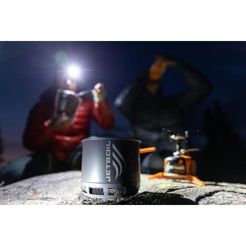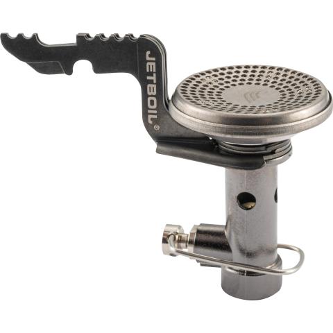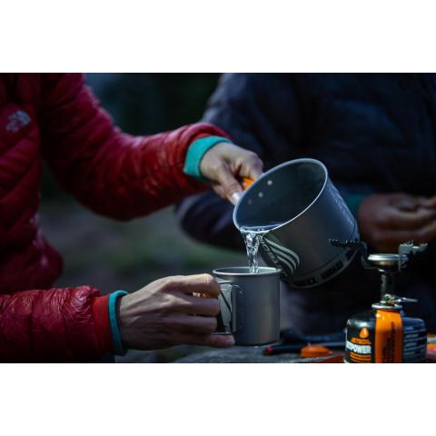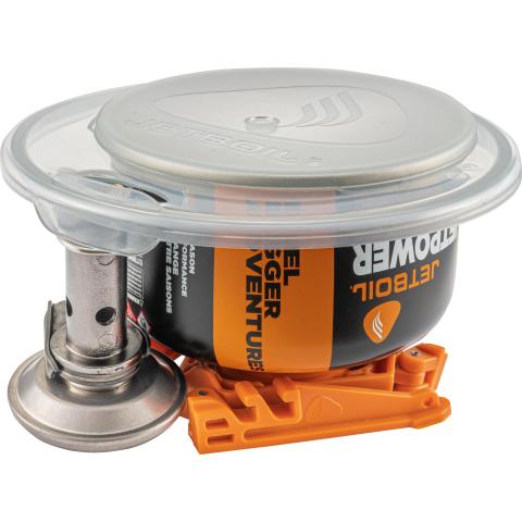 Erittäin suorituskykyinen ja varmatoiminen poltinosa. Patentoitu, tuulisuojattu FluxRing-pohja siirtää lämmön tehokkaasti ja tasaisesti kuppiin. Lämmönsiirtokapasiteetti 4 500 BTU (1,32 kW), jolla keitin keittää 0,5 litraa vettä kiehuvaksi 2 min 30 sekunnissa Jetpower kaasulla! Keittoastiassa on eristetty kahva, joka kääntyy kuljetuksen ajaksi kattilan päälle. Poltin sytytetään esimerkiksi tulitikulla tai tuluksella.