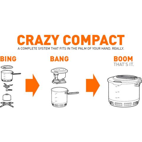 Ultrakevyt keitinkokonaisuus, joka pakkautuu poikkeuksellisen pieneen tilaan ja keittää erittäin tehokkaasti vettä. All-in-one -ratkaisu, jonka kaikki osat 0,8 litran kattilaan. Kannessa on valmis pidike 100g kaasulle. Pakattuna koko on 112 x 130 mm. Myös 230 g kaasu mahtuu kattilaan, jos siellä ei ole muita keittimen osia. Paino keveimmillään toimintavalmiudessa on vain 201 g (keitin + kattila, ilman kaasua). Paino kaasusäilöin jalan kanssa 232 g.