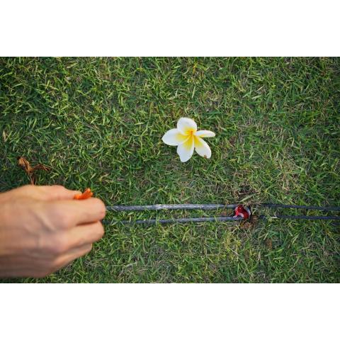 Kiilojen kiinnittäminen maahan ja sen jälkeen köyden kiinnittäminen pyörään/sauvoihin on todella nopeaa. Toimii myös heikompien puiden, kävelysauvojen tai jopa moottoripyörän kanssa.