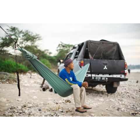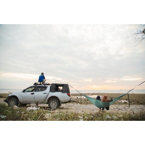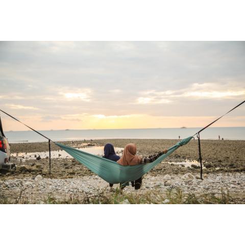 Alkuperäisvalmistajan Compact Hammock on entistäkin helppokäyttöisempi. Riippumatossa oleskelemisen lisäksi nyt myös asentaminen on hauskaa: Compact Hammock Express Setting Bag on uusi ratkaisu, jolla pääset kirjaimellisesti mukavuusalueelle käden käänteessä. Irrotettavan puolikuun muotoisen säilytyspakkauksen lisäksi Compact Hammockissa on nyt myös toinen, kiinteä suorakaiteen muotoinen tasku, johon riippumaton voi pakata. Tilaa riittää hyvin yhdelle henkilölle ja keveytensä ansiosta Compact Hammock kulkee helposti mukana.