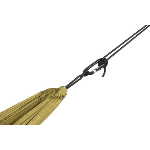 Hammockin mukana tulevat varusteet tekevät asentamisesta helppoa. Mukaan kuuluvat Nautical Ropes-kiinnitysköydet, 22kN karabiinit, suojasukka sekä suuri pyöreä tyynymäinen säilytyspussi.