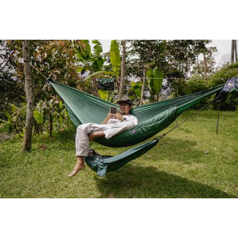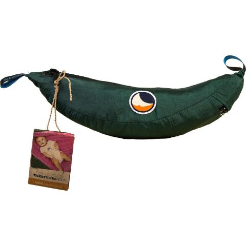 Lapsille suunniteltu laskuvarjokankainen vihreä riippumattosetti. Toimii sänkynä ja keinuna. Mahtuu pakattuna pieneen tilaan.