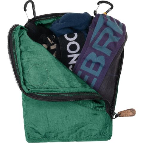 Pakkauskuution kulmissa on pienet lenkit, joihin saa mukana tulevan karabiinin kiinnitettyä ja joilla kuutio on kätevä kiinnittää melkein mihin vain. Kuutiot voi pakata myös sisäkkäin.