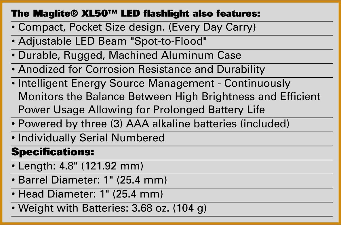 Maglite LED XL50 Tactical Combo Pack sisältää valaisimen, MOLLE-yhteensopivan lasikuituvahvisteisen taskuklipsin, kiinnitysavaimen klipsille, 3xAAA laadukkaat alkaliparistot, vierimisenesto/linssinpidikeholkin sekä värilinssit: punainen, sininen ja vihreä.