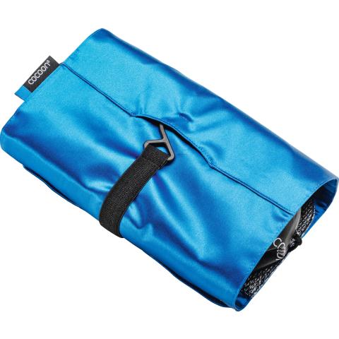 100 % silkkinen, ohut, kompakti ja kevyt toilettilaukku irrotettavalla, läpinäkyvällä nestepussilla. Koko 24 x 17 x 1 cm. Paino 100 g + 27 g.