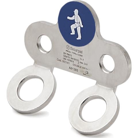 Ankkuripiste putoamissuojaimen kiinnittämiseen. Kaksi kiinnityspistettä. Yläosassa selkeä kuvake ilmoittamassa mihin käyttöön ankkuripiste on tarkoitettu. Kiinnitys taustamateriaaliin soveltuvalla M12 pultilla (ei sis. toimitukseen).