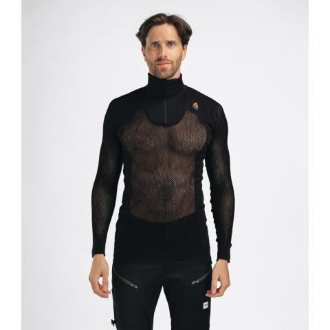 Miesten ainutlaatuinen, pitkähihainen, verkkoaluspaita poolokauluksella ja vetoketjulla. Lämpötilan hallinnan ja mukavuuden kannalta luonnonkuitujen yhdistäminen tekokuituihin on ylivoimaisen hyvä ratkaisu. Woolnet-rakenne, jossa käytetään pehmeää merinovillaa, on aina sopivan lämpöinen ja erittäin hyvin hengittävä. Kuitu imee jopa 30% kosteutta itseensä, ennen kuin se alkaa tuntua märältä. Hartiat ja kyynärpäät on erikseen vahvistettu. Total Easy Care-käsittelyn ansiosta Woolnet ei kutita, ja kutistuu erittäin vähän.