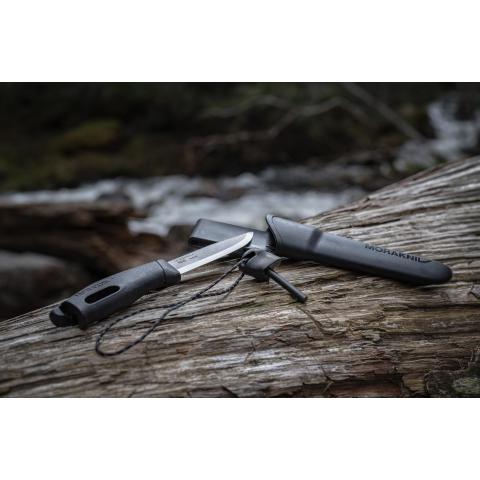 TPE (Thermo Plastic Elastomer) kahva, jonka kuviointi tarjoaa erinomaisen otteen, tarjoaa tarkkuutta tehostaen työskentelyä ja tuntuu miellyttävältä myös kylmissä olosuhteissa. Kovaakin käyttöä kestävä ¾ tang terä Scandi Grind profiilihionnalla. Terän materiaali ruotsalainen ruostumaton 12C27 erikoisteräs, joka on käsitelty Moraknivin salaisella lämpökäsittelyllä. Pysyy terävänä pitkään ja sietää kosteitakin olosuhteita. Hamarapuoli hiottu 90-asteen kulmaan, joka on ihanteellinen tulustikun tehokkaaseen käyttöön. Kokonaispituus: 238 mm. Terän pituus: 104 mm. Terän paksuus: 2,5 mm. Puukon paino 128 g. Kokonaispaino 198 g. Muovituppi on klipsin ansiosta helppo kiinnittää vyölle tai reppuun. Pohjassa vedenpoistoaukko. Materiaali- ja valmistusvirhetakuu 10 vuotta. Valmistusmaa Ruotsi.