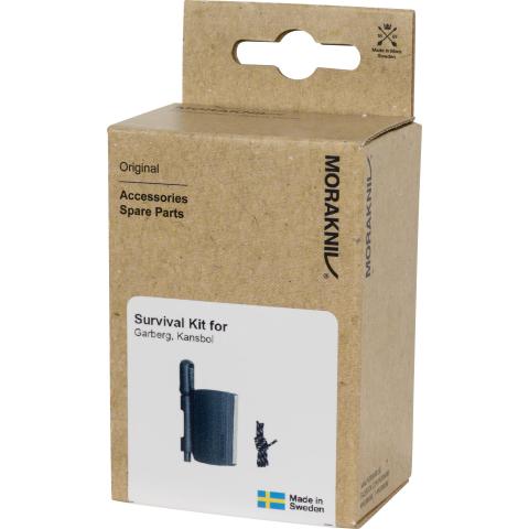 Selviytymispakkaus Morakniv Kansbol ja Garberg puukoille. Pidike kiinnitetään puukon muovituppiin ja siinä on magnesiumtulustikku ja täyspituinen timanttiteroitin. Helppo kiinnittää ja irrottaa tupesta vain napsauttamalla.