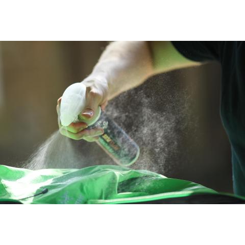 4. Poista ylimääräinen aine kostealla liinalla ja anna kuivua luonnollisesti, tai kuivaa rumpukuivaajassa mikäli varusteen hoito-ohjeet sen sallivat.