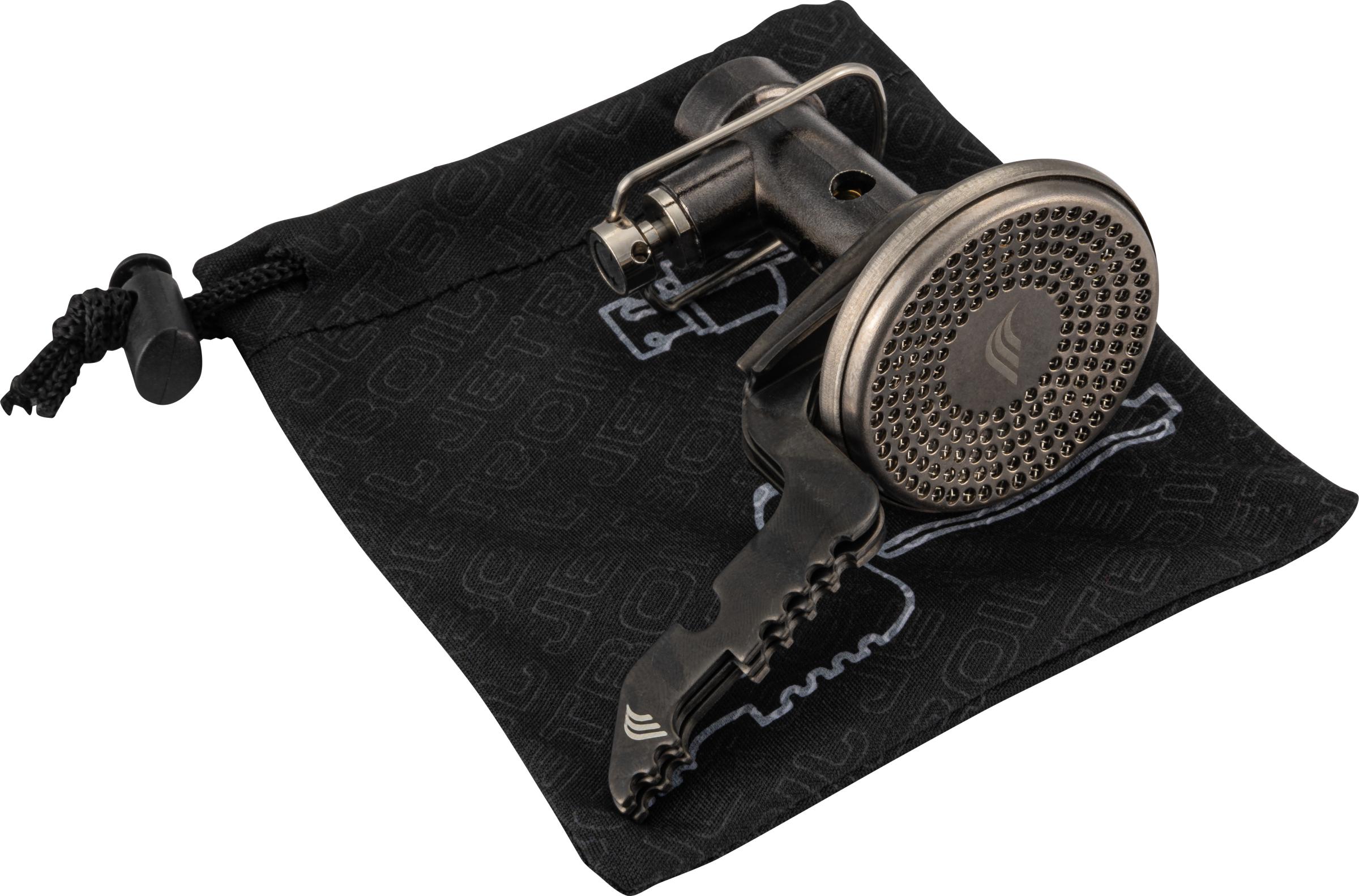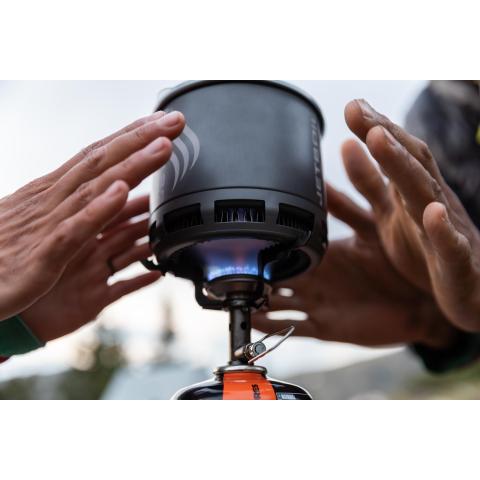 Erittäin suorituskykyinen ja varmatoiminen poltinosa. Patentoitu, tuulisuojattu FluxRing-pohja siirtää lämmön tehokkaasti ja tasaisesti kuppiin. Lämmönsiirtokapasiteetti 4 500 BTU (1,32 kW), jolla keitin keittää 0,5 litraa vettä kiehuvaksi 2 min 30 sekunnissa Jetpower kaasulla! Keittoastiassa on eristetty kahva, joka kääntyy kuljetuksen ajaksi kattilan päälle. Poltin sytytetään esimerkiksi tulitikulla tai tuluksella.
