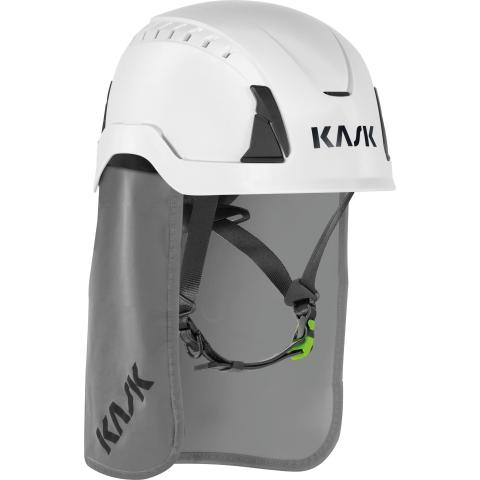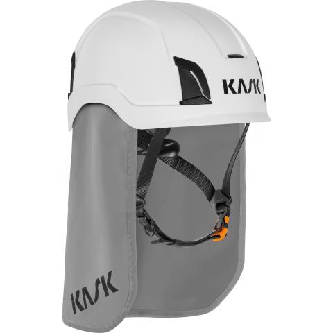 Harmaa niskasuojus Kask Primero, Zenith X ja Zenith X MAX työkypärien takahelmaan. Helposti kypärässä oleviin kiinnityskoloihin napsauttamalla kiinnitettävä malli, joka suojaa niskaa ja korvalehtiä haitallisilta ultraviolettisäteiltä (UVA/UVB UPF50+), vesisateelta, lumisateelta, puupurulta, roiskeilta jne. Sivusuojaus säädettävissä. Suunniteltu käytettäväksi myös kuppikuulonsuojainten kanssa.