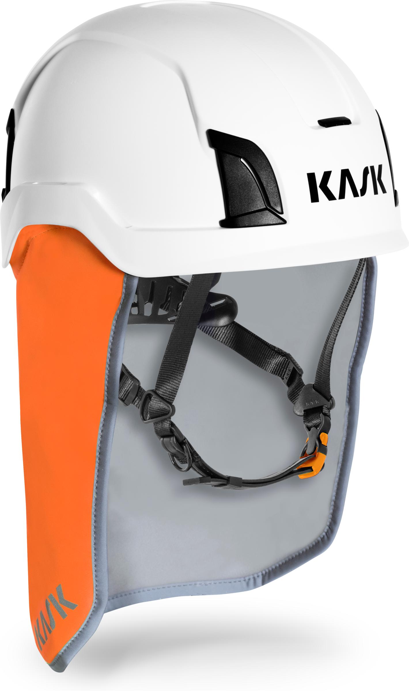 Tuulen- ja vedenpitävä hengittävästä materiaalista valmistettu niskasuojus Kask Zenith X, Zenith X MAX ja Primero työkypärien takahelmaan. Helposti kypärässä oleviin kiinnityskoloihin napsauttamalla kiinnitettävä malli, joka suojaa niskaa ja korvalehtiä tuulelta, vesisateelta, lumisateelta, puupurulta, roiskeilta jne. Sivusuojaus säädettävissä.