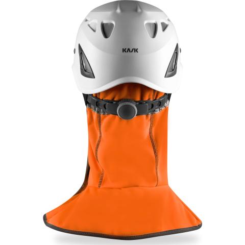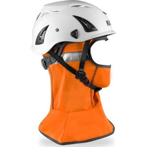 Kylmiin työolosuhteisiin suunniteltu päätä ja korvia lämmittävä korkealuokkainen kypärähuppu kaikkien työ- ja pelastuskypärien kanssa käytettäväksi.