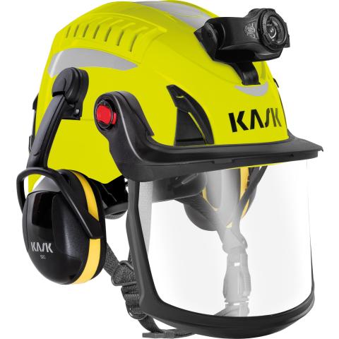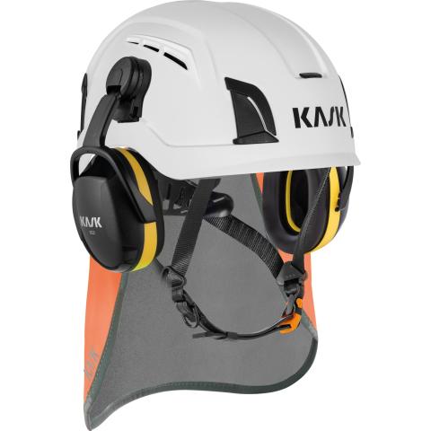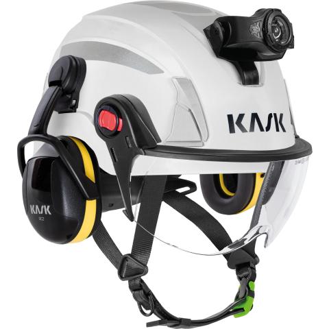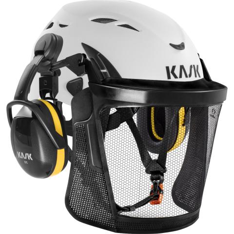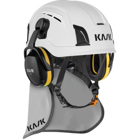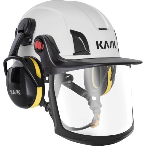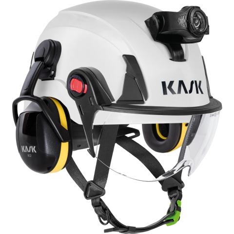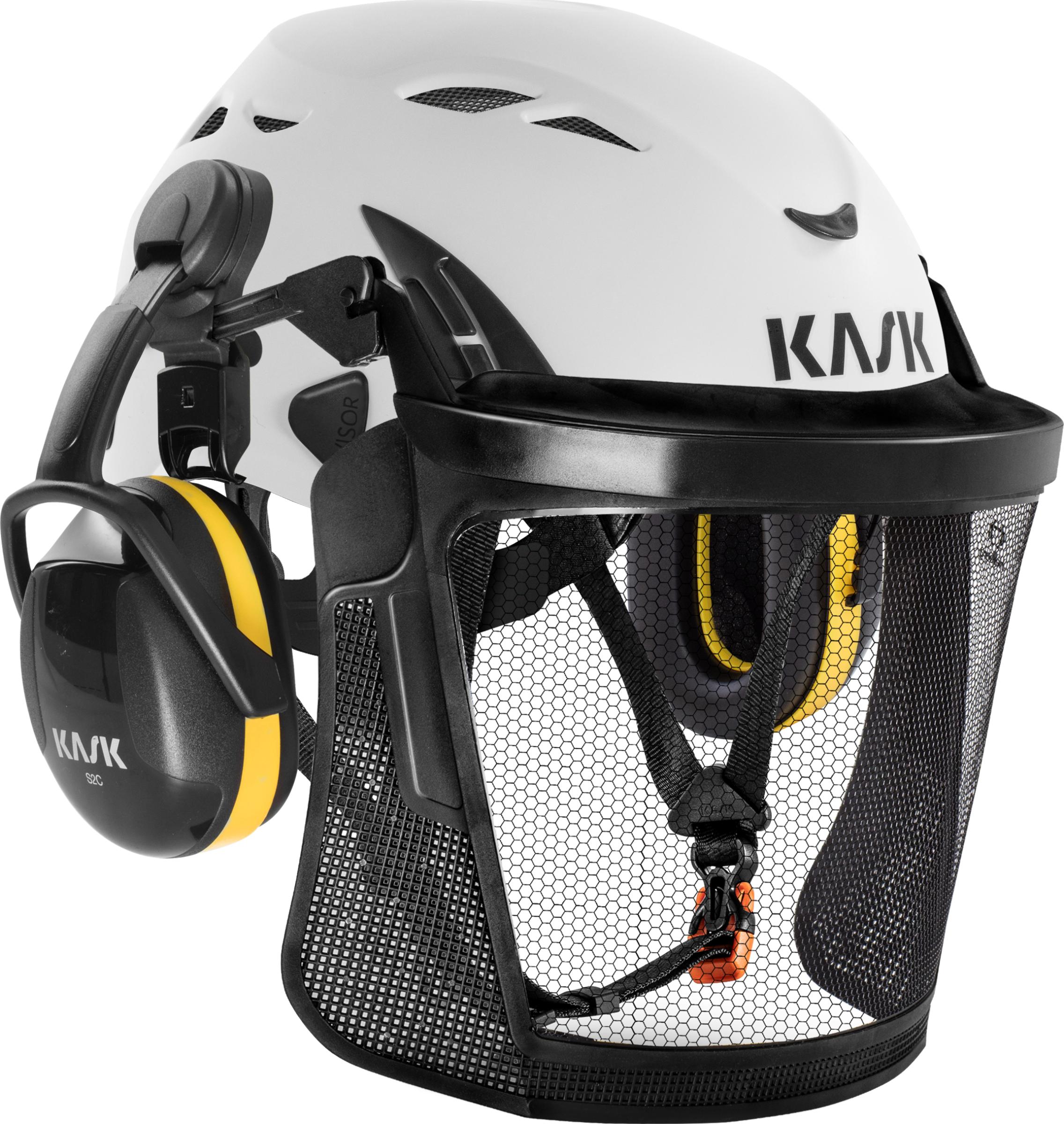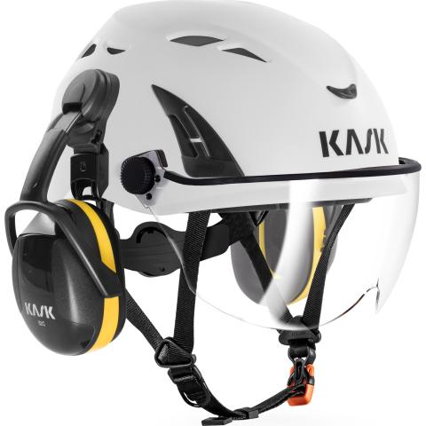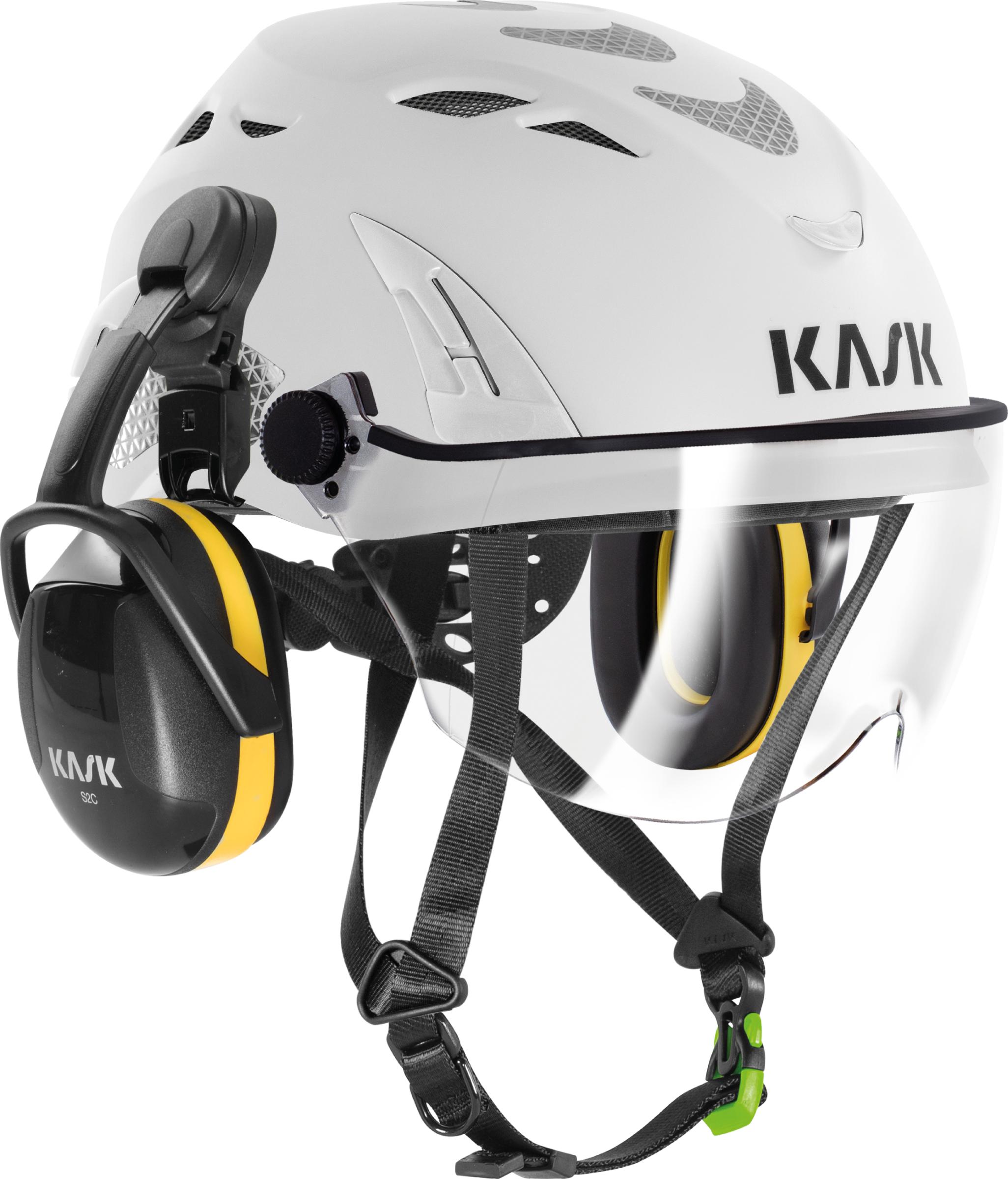 Kypäräkiinnikkeiden alalaidassa on käytävät, joihin saadaan liu’utettua Kask Superplasma Mesh Visor Carrier (WVI00005-) kokokasvosuojainten yläkehyksen varret. Tämä tarjoaa helpon ja kattavan silmien- ja kasvojensuojauksen samalla kun kuulosuojaimet ovat asennettuina.
