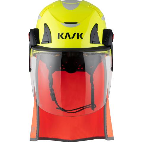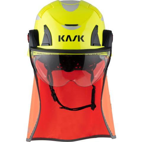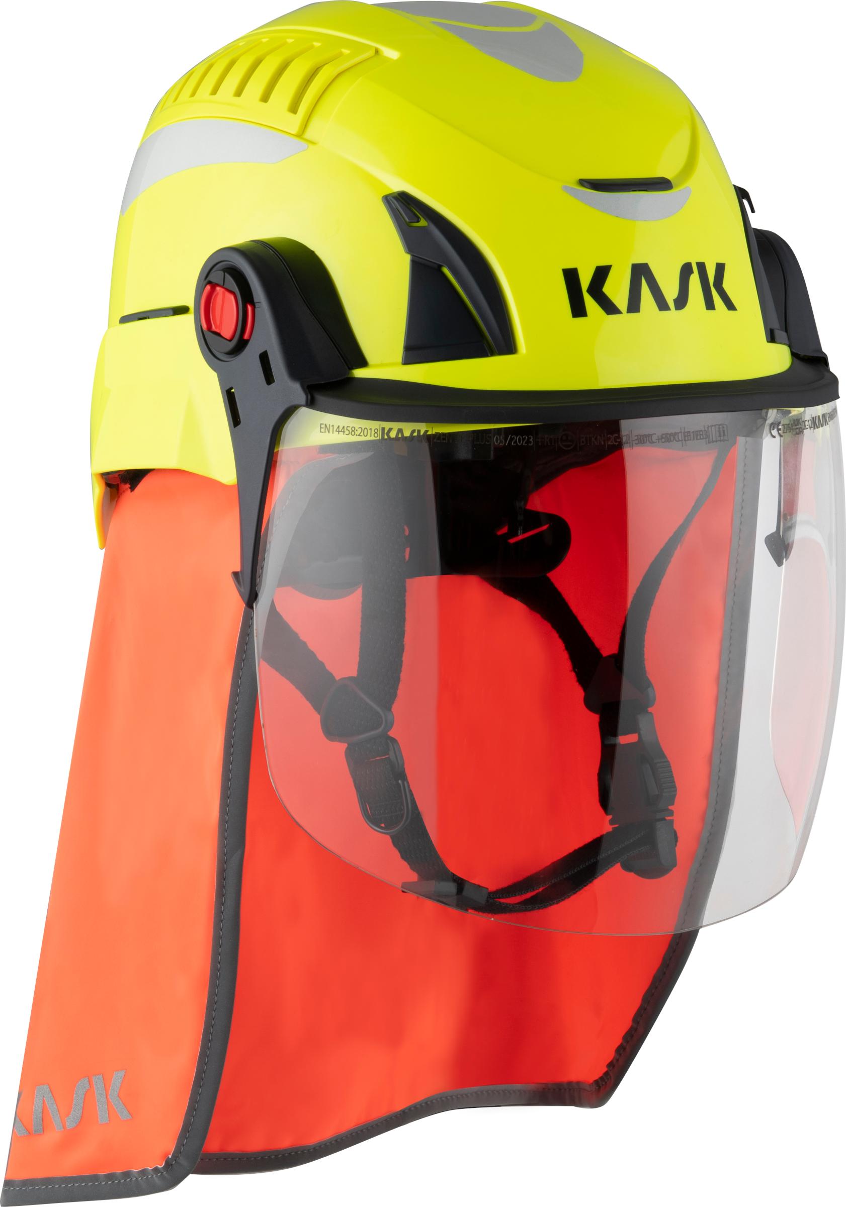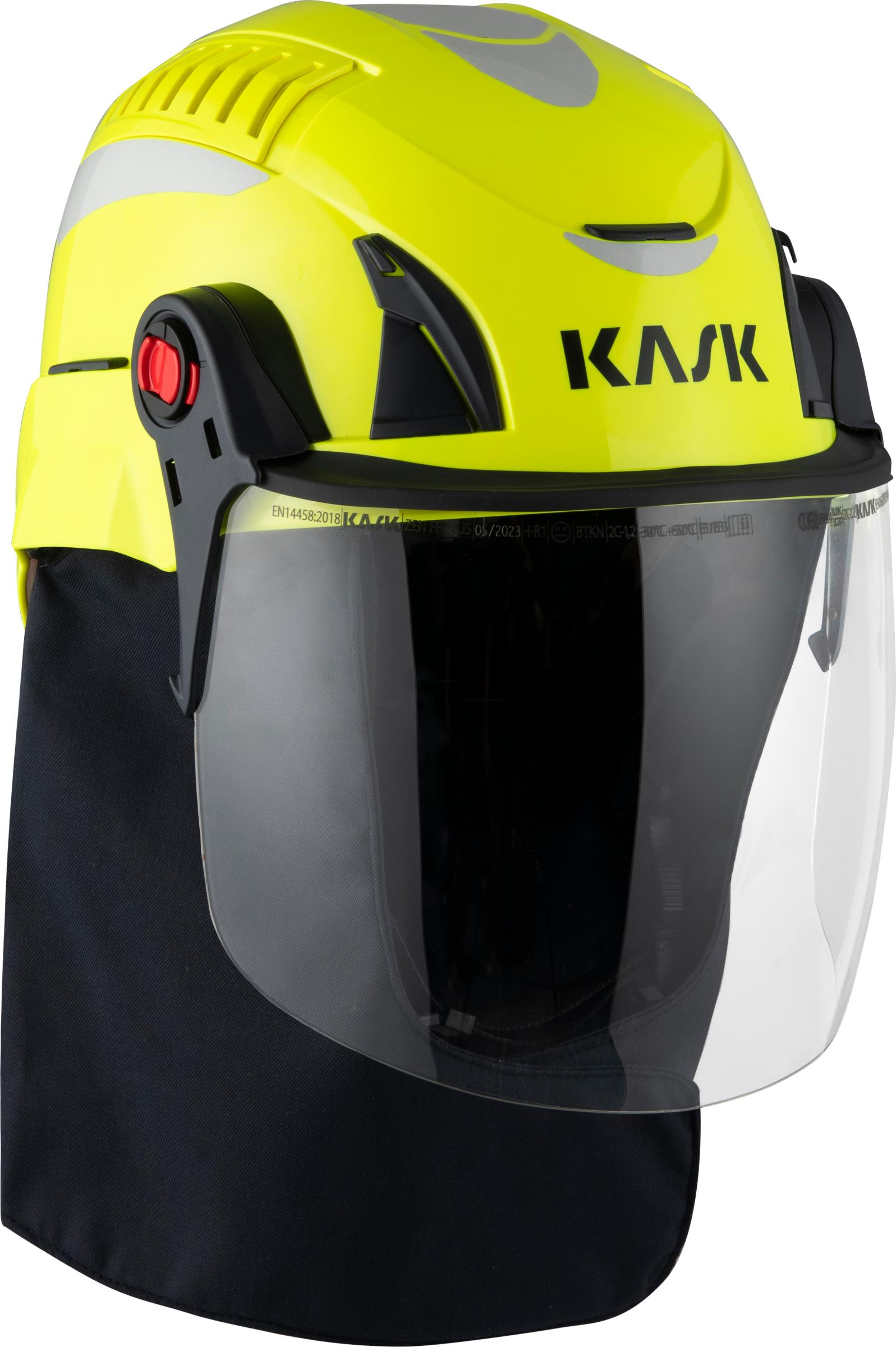 Kirkas palosertifioitu kokokasvosuojain ja palosuojatut Kask EasyClick Adapter FR työkypärädapterit (WAC00074-) yhdistelmäpakkauksena. Täyttää Kask Quantum pelastuskypärän kanssa käytettäessä maastopalostandardin (EN 16471) sekä teknisen pelastustyön standardin (EN 16473) vaatimukset, eli suojaa tilanteissa missä on liekkikosketuksen riski. Voidaan käyttää myös omien silmälasien päällä.
