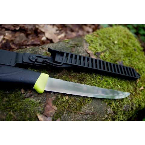 Monikäyttöisen terän materiaali kylmävalssattu ruotsalainen ruostumaton Sandvik erikoisteräs. Veitsen kuvioidusta kumipintaisesta kahvasta saa hyvän otteen myös märkänä. Kokonaispituus: 265 mm. Terän pituus: 150 mm. Terän paksuus: 2,0 mm. Veitsen paino: 115 g.