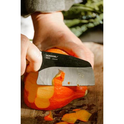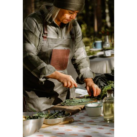 Käsityönä valmistettu ohutteräinen full tang veitsi, joka on suunniteltu ihanteelliseen ruuanlaittoon ulkoilmaolosuhteissa. Kompakti ja monipuolinen malli, joka on suunniteltu kulkemaan helposti mukana taskussa tai repussa. Varuste, joka mahdollistaa kokkaustaitojen kehittämisen uudelle tasolle. Toimitetaan kasvivärjätyn nahkasuojuksen kanssa, joka suojaa veitsen terää huolellisesti.