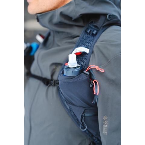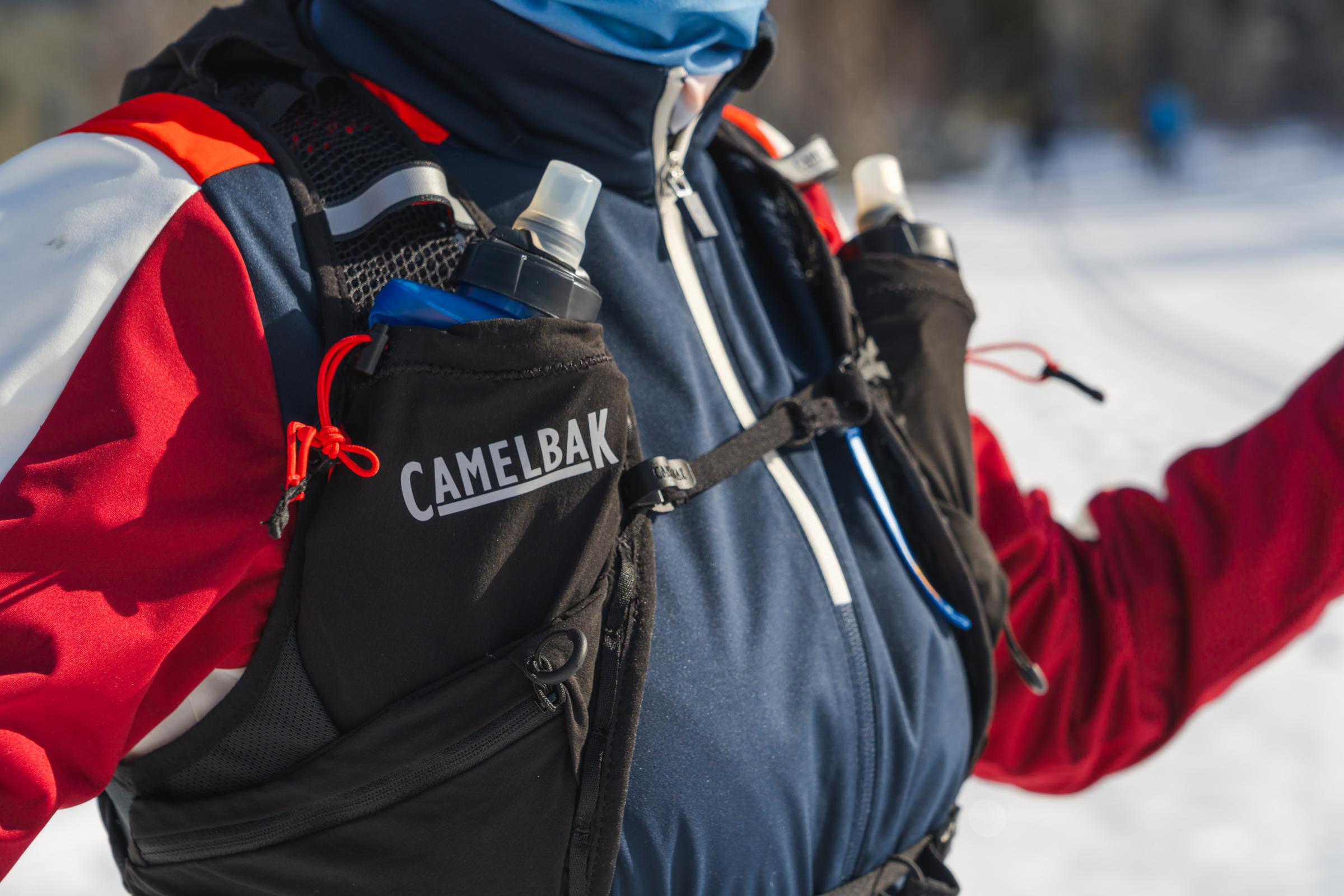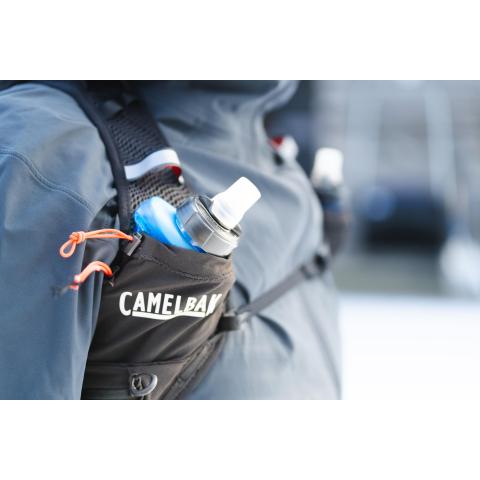 Liivi on suunniteltu ultrakevyeksi ja mallin istuvuus on huippuluokkaa, jolloin se pysyy paikallaan vauhdikkaammassakin kisassa. Etupuolella on kaksi joustavaa taskua CamelBak Quick Stow 0,5L pulloille (sis.), jolloin juoksijalla on mahdollisuus varata toinen pullo vaikka urheilujuomalle ja toinen vedelle.