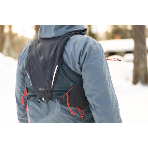 Apex Pro Vestissä on myös täysin pakkautuva ja irroitettava sauvapussi joka sijoittuu olalta liivin takaosan keskelle jolloin sauvat ovat todella hyvin saatavilla.