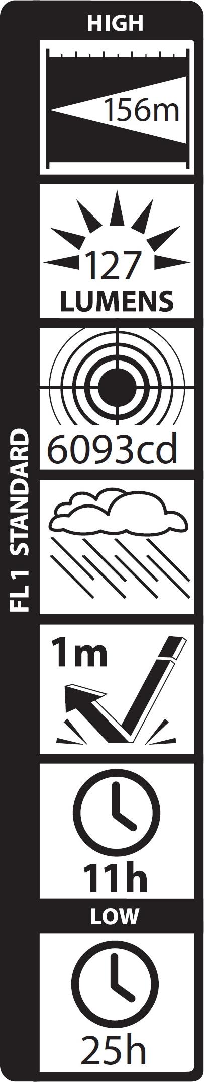 Suorituskyky ANSI FL1 standardin mukaisesti: Valon kantama 156 m, valovirta 127 lumenia, valon voimakkuus 6093 candelaa. Paloaika High asetuksella 11 h ja Low asetuksella 25 h (joiden jälkeen on vielä 10% alkuperäisestä voimakkuudesta jäljellä). Roiskevesitiivis, iskunkestävä 1 m.