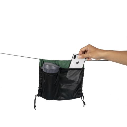 Kaksi karabiinia mahdollistavat vaivattoman yhdistämisen riippumattoon: Voit vain pitää kiinni, ja vetää merkatuista kohdista, ja asentaa ylänarun haluamaasi pituuteen aina 320 cm asti. Hammock ylänarun alapuolella asettuu tällöin täydelliseen pituuteen ilman erillistä säätämistä ja ajankäyttöä ja kokeilemista.