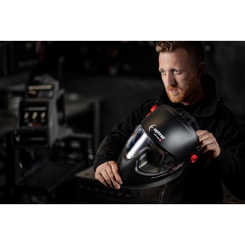 Jotta näkymättömien epäpuhtauksien hengittämisen voi välttää laserprosessin aikana, henkilönsuojainkokonaisuuteen on lasertyöskentelyssä sisällytettävä aina myös asianmukainen hengityksensuojain. Tämä maski onkin suunniteltu toimimaan ihanteellisesti myös Optrel Swiss Air moottoripuhallin -hengityksensuojaimen kanssa yhdessä käytettäessä. Tällöin puhallin ja hitsausmaski toimivat itsenäisinä erillisinä järjestelminä.