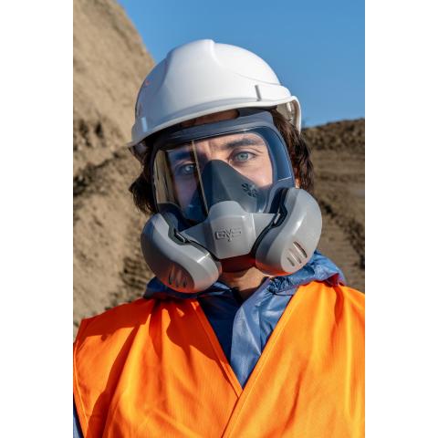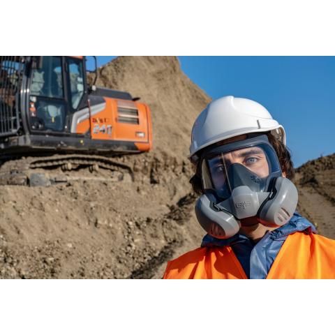 Kevyt kokokasvomallinen hengityksensuojain tiiviillä silmiensuojaimella ja vaihdettavalla A2P3 R D yhdistelmäsuodatinparilla: Hiukkassuodatus ja kaasusuodatus. Poikkeuksellisen leveä näkökenttä.