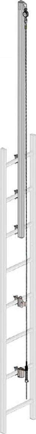 Toimitukseen sisälly: Vaijeri päätöksin molemmissa päissä, ylimpiin tikkaiden puoliin asennettava jatkovarsi joka ulottuu 1,3 m ylimmästä puolesta ylöspäin mahdollistaen turvallisen poistumisen ja järjestelmään ylhäältä tulemisen, ala-. ja yläpään kiinnityspisteet, välivarmistuspisteet ja kiristin.