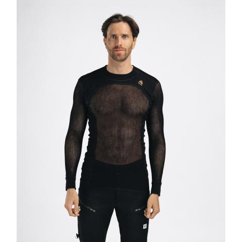 Miesten ainutlaatuinen pitkähihainen verkkoaluspaita. Lämpötilan hallinnan ja mukavuuden kannalta luonnonkuitujen yhdistäminen tekokuituihin on ylivoimaisen hyvä ratkaisu. WoolNet-rakenne, jossa käytetään pehmeää merinovillaa, on aina sopivan lämpöinen ja erittäin hyvin hengittävä. Kuitu imee jopa 30 % kosteutta itseensä, ennen kuin se alkaa tuntua märältä.