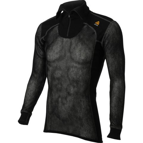 Miesten ainutlaatuinen, pitkähihainen, verkkoaluspaita poolokauluksella ja vetoketjulla. Lämpötilan hallinnan ja mukavuuden kannalta luonnonkuitujen yhdistäminen tekokuituihin on ylivoimaisen hyvä ratkaisu. Woolnet-rakenne, jossa käytetään pehmeää merinovillaa, on aina sopivan lämpöinen ja erittäin hyvin hengittävä. Kuitu imee jopa 30% kosteutta itseensä, ennen kuin se alkaa tuntua märältä. Hartiat ja kyynärpäät on erikseen vahvistettu. Total Easy Care-käsittelyn ansiosta Woolnet ei kutita, ja kutistuu erittäin vähän.