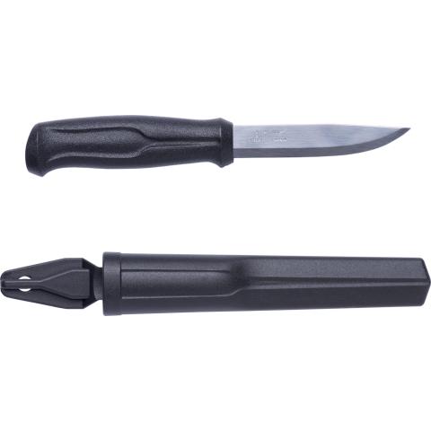 Kumipintainen pehmeä kahva tarjoaa erinomaisen otteen ja tehostaa työskentelyä. Terän materiaali runsashiilinen teräs. Kokonaispituus: 225 mm. Terän pituus: 102 mm. Terän paksuus: 2,5 mm. Paino 123 g. Mustan muovitupen pohjassa tyhjennysreikä ja ylhäällä vyölenkki.