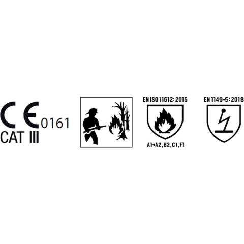 - Sertifiointi: EN 16073-9. EN ISO 11612:2015: A1, A2, B2, C1, F1. EN1149-5:2018. CE. Riskiluokka III henkilönsuojain