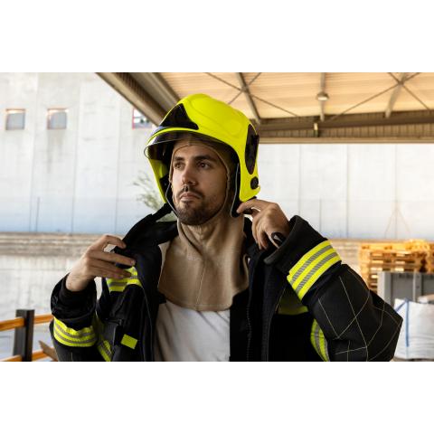 - Suojaa kasvoja, päätä ja kaulaa kuumuusuhkilta, kuten liekkikosketukselta, kipinäpurkaukselta, kosketuskuumuudelta, säteilykuumuudelta jne. Suojaa lisäksi niitä alueita kattavasti karsinogeeneiltä ja pienhiukkasilta, jotka niille yleisesti eniten altistuvat.