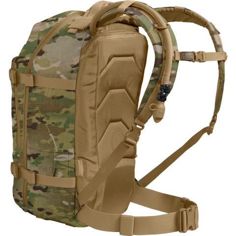 Taktiseen käyttöön suunniteltu tilava CamelBak Mil Spec juomareppu. Soveltuu 1-2 päivää kestäviin tehtäviin. Kantojärjestelmä ilmastoidulla Air Director selkäpaneelilla ja kevennetyllä lantiovyöllä on erittäin mukava. Lantiovyö voidaan syöttää kokonaan repun rakenteen sisään, kun sitä ei haluta käyttää. Kokoonsa nähden kevyt kokonaisuus toimii tehokkaasti mahdollistaen pitkäaikaisen yhtäjaksoisen toimimisen kaikkein vaativimmissakin olosuhteissa. Repusta pääsee nopeasti irti pikasoljellisten olkaviilekkeiden ja lantiovyön ansiosta. Kompressiohihnat pitävät repun tiiviinä pakettina selässä. Repun painopiste siirtynyt selässä alemmas Low Rider™ juomasäiliön taskun ansioista. Sisältää matalaprofiilisen Mil Spec Crux™ Lumbar juomasäiliön ja eristetyn juomaletkun sulkuventtiilillä, QuickLink liittimillä ja suukappaleen suojuksella. Letku voidaan irrottaa pikaliittimellä suukappaleesta ja liittää suoraan kaasunaamariin.