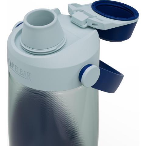 Korkki on helppo avata kääntämällä, ja se aukeaa pullon kantta vasten pysyen auki. Myös täyttäminen hanasta juoma-aukon kautta on nopeaa, siistiä ja käytännöllistä. Kantta ei siis tarvitse avata lainkaan muuten kuin pesua varten. Rakenne myös eliminoi mahdollisuuden kadottaa korkki. Juoma-aukon kulma, mitoitus ja muotoilu on suunniteltu tarjoamaan suuren veden virtaaman, jotta kerta-annos voi tarvittaessa olla riittävä. Suuaukko on kauttaltaan sileä, jolloin huulet menevät aukon reunojen kanssa tiiviisti. Soveltuu myös likaisiin olosuhteisiin: silikonilenkillä toimiva korkki suojaa suuaukkoa ja se on helppo pitää puhtaana.