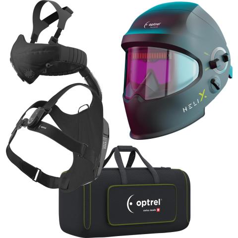 Ready-To-Weld käyttövalmis pakkaus hitsaus- ja hiontatöihin vaativaan ammattikäyttöön. Sisältää Optrel Helix 2,5 hitsausmaskin irrotettavalla mustalla Helix Hard Hat EN397 teollisuuskypäräinsertillä, sekä Optrel Swiss Air moottoripuhallin hengityksensuojaimen Comfort Half Mask puolinaamarilla, Control Panel ohjauspaneelilla, sekä laukun.