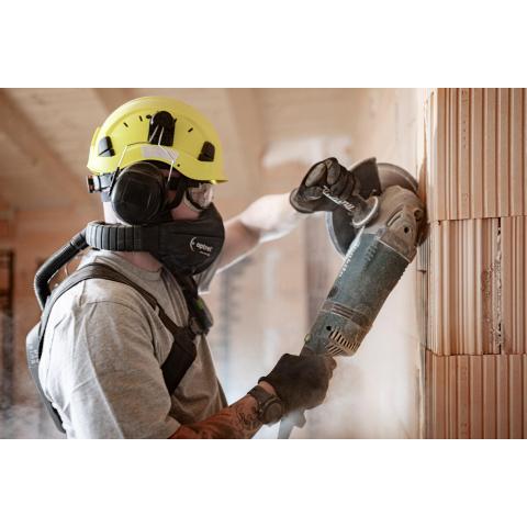 - Väljästi istuva tuulettuva puolinaamari, joka on valmistettu paloturvallisesta materiaalista, peittää suun ja nenän alueen kokonaan. Ylipaine tukee hengitystä ja estää väsymystä.