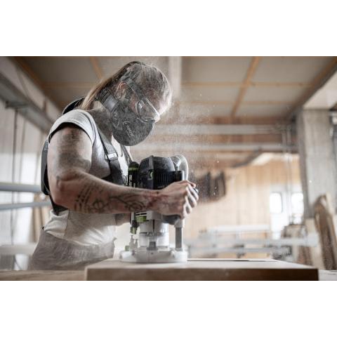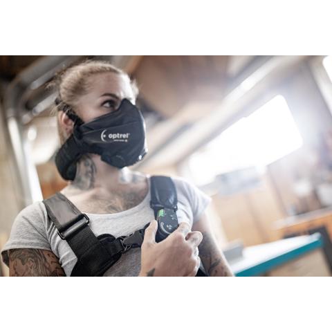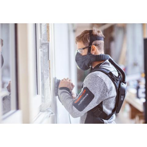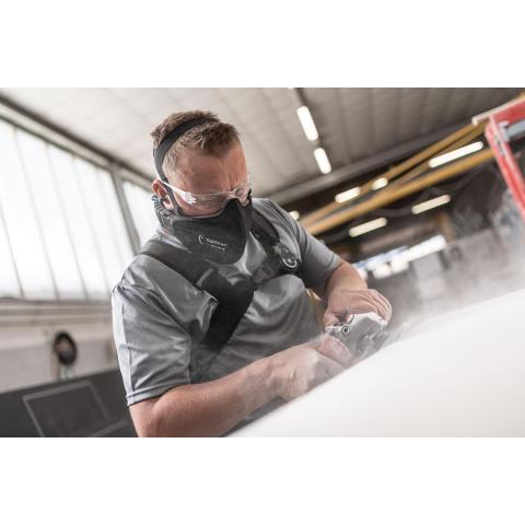 - Väljästi istuva tuulettuva puolinaamari, joka on valmistettu paloturvallisesta materiaalista, peittää suun ja nenän alueen kokonaan. Ylipaine tukee hengitystä ja estää väsymystä.