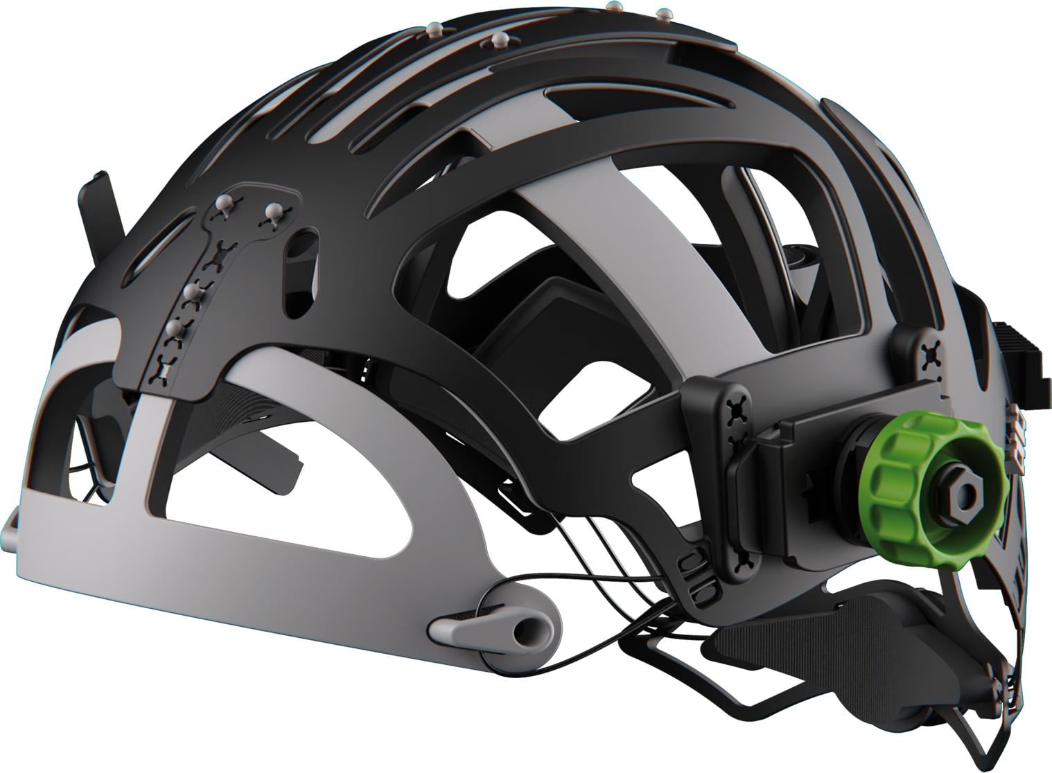 IsoFit -pääpannasto vihreillä säätönupeilla. Uniikki Optrel -tuote, joka tarjoaa maksimaalista työergonomiaa. Vaihdettavat pehmusteet.