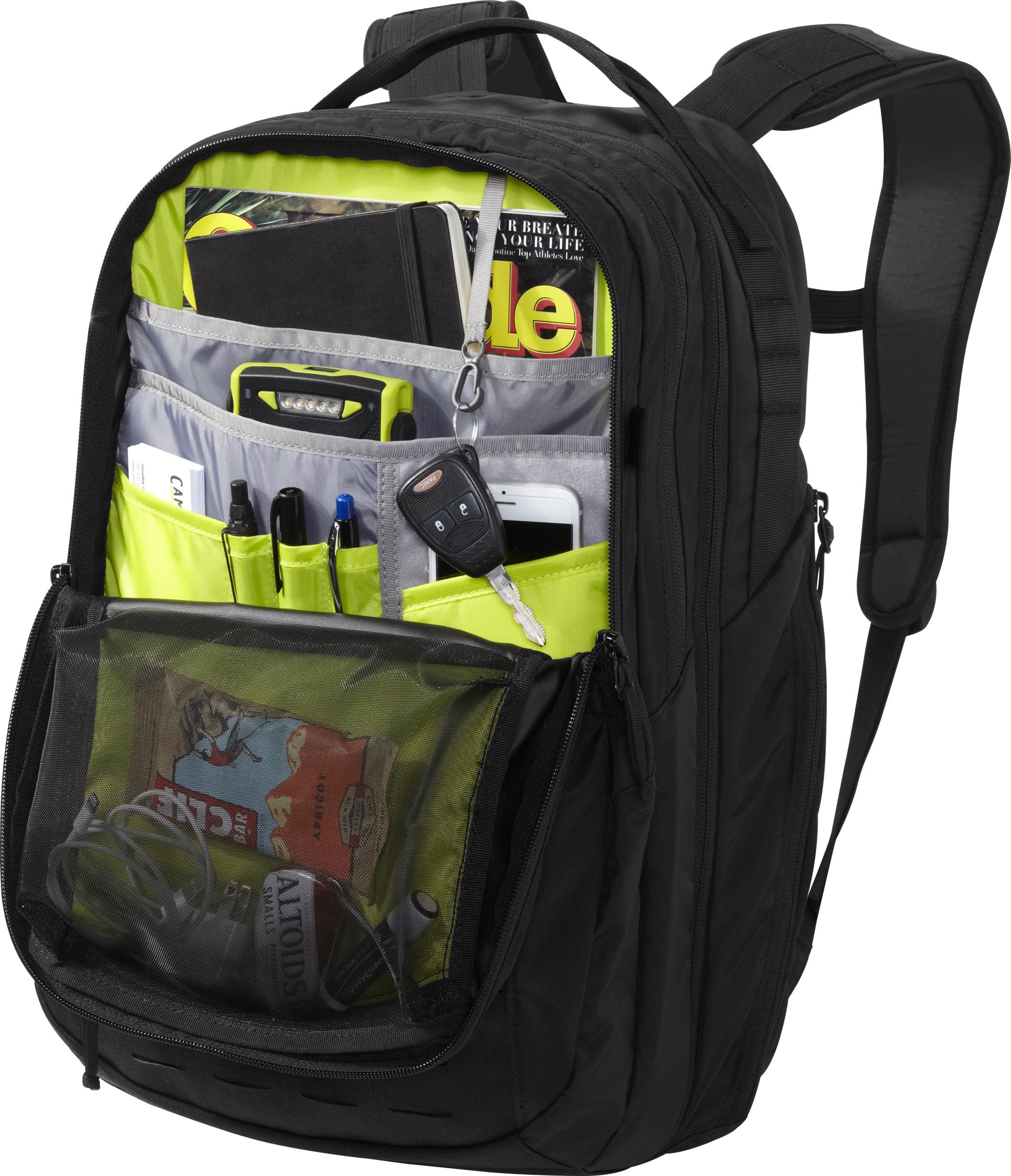 Pehmustettua ja eristettyä läppäritaskua voidaan käyttää myös Mil Spec Antidote vesisäiliön (lisävaruste) taskuna kun halutaan enemmän nesteytyskapasiteettia. Taskussa vesitiivis polyuretaanivetoketju, jonka ansiosta läppäri pysyy suojassa kovemmassakin kelissä. Air Director selkäpaneeli Dynamic Suspension kantojärjestelmällä tarjoaa kokonaisuuden, jossa ilma liikkuu selän alueella ja mukavuus on uudella tasolla myös silloin kun repussa on paljon varusteita tai asiakirjoja. Olkaviilekkeissä 15mm EVA pehmusteet. Lantiovyö irrotettavissa ja kompressiohihnat voidaan työntää pieniin integroituihin taskuihin. Suuritilavuuksinen päätasku, jossa fleecevuorattu tasku aurinkolaseille ja erillinen lokero turvassa pidettäville asiakirjoille. Etupuolen lokerossa taskut pientarvikkeille, avainnyöri, sekä turvatasku tärkeille matkadokumenteille. Ylhäällä fleecevuorattu ulkotasku mediasoittimelle tai puhelimelle. Sivuilla kaksi vetoketjutaskua läppärin laturijohdolle ja juomapullolle.