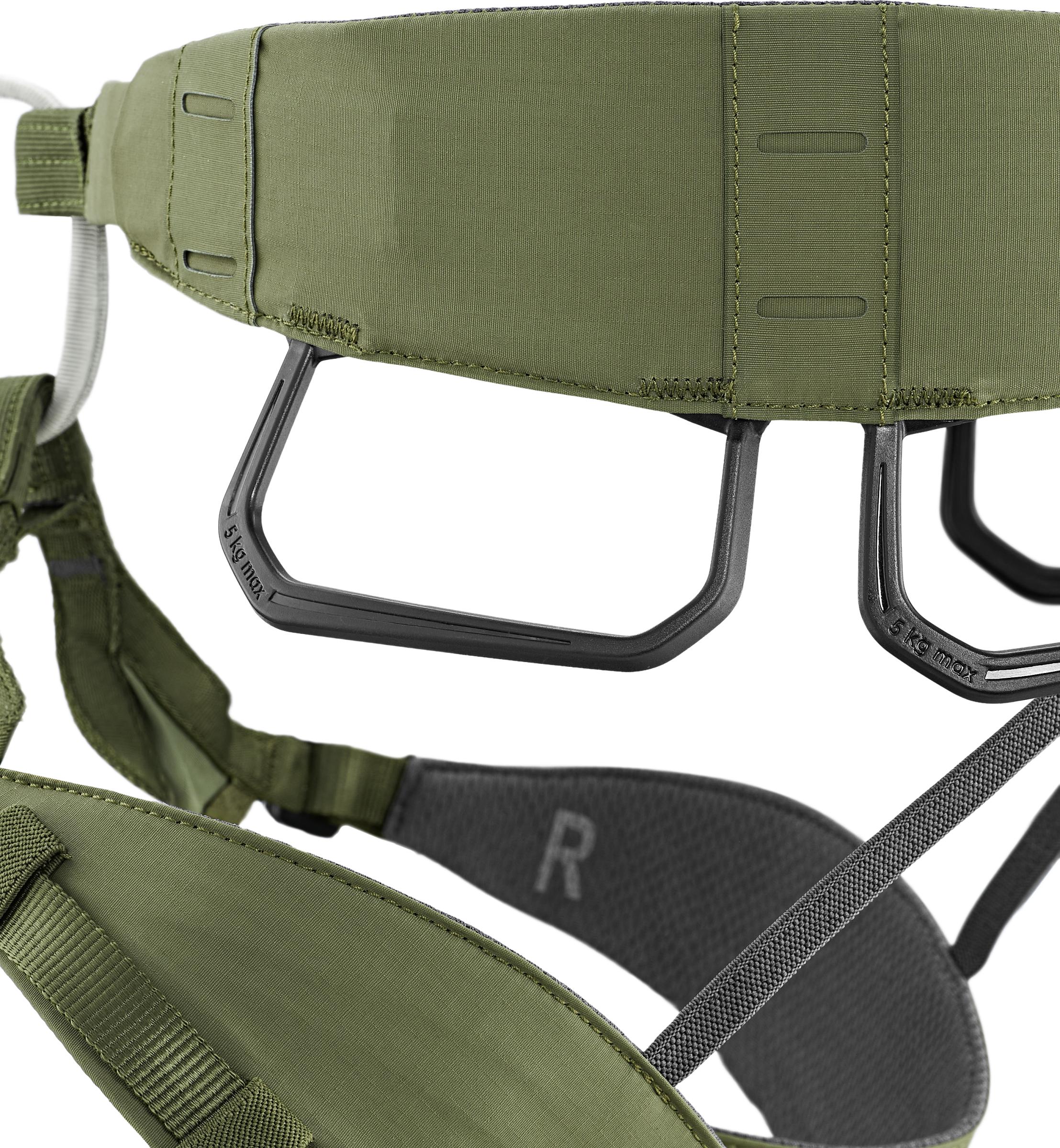 Neljä tilavaa jäykistettyä varustelenkkiä, ja yksi litteä takana, sekä neljä kiinnityslenkkiä karabiineille tai jääruuvikiinnikkeille tarjoavat runsaasti säilytystilaa ja hyvät vaihtoehdot varusteiden järjestämiseen.