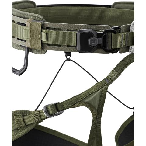 - Kaksi notkeaa varustelenkkiä, jotka voidaan sijoittaa yksilöllisesti valjaiden MOLLE-aukkoihin, varmistavat, että kaikki kiinnitetyt varusteet ovat aina käden ulottuvilla.
