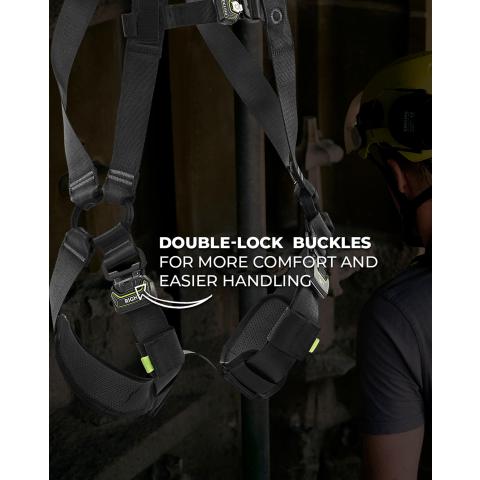 Putoamissuojainkokovaljaat työskentelyyn putoamisvaarallisissa olosuhteissa. Nopeasti puettava, kevyt, helposti säädettävä ja erinomaisen liikkuvuuden tarjoava malli, jossa Double Lock pikasoljelliset jalkalenkit sekä rintahihna. Kiinnityspisteet rinnassa ja selässä. Lisäsertifioitu 150 kg käyttäjille asti sekä kansainväliseen käyttöön. Soveltuu osaksi putoamisen pysäyttävää- tai kulunrajoitusjärjestelmää.