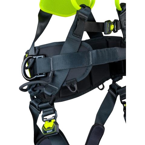 - Lantiovyön sivuilla työasemointiin alumiiniset kiinnityspisteet (EN358), jotka käännettävissä lantiovyötä vasten, kun niitä ei tarvita, joka helpottaa liikkumista ahtaissa tiloissa