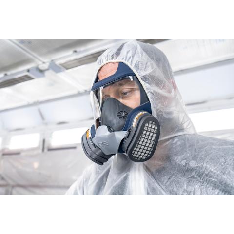 Kevyt kokokasvomallinen hengityksensuojain tiiviillä silmiensuojaimella ja vaihdettavalla A1P3 R D yhdistelmäsuodatinparilla: Hiukkassuodatus ja kaasusuodatus. Poikkeuksellisen leveä näkökenttä.